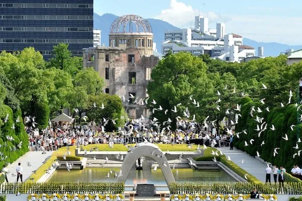 Doves fly over the Hiroshima Peace Memorial Park in western Japan on August 6, 2012 during a memorial ceremony to mark the 67th anniversary of the atomic bombing of Hiroshima. Tens of thousands of people marked the anniversary of the atomic bombing of Hiroshima as a rising tide of anti-nuclear sentiment swells in post-Fukushima Japan. AFP PHOTO / Kazuhiro NOGI (Photo credit should read KAZUHIRO NOGI/AFP/GettyImages)