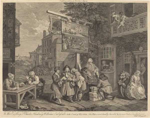 "File:Charles Grignion after William Hogarth, Canvassing for Votes, 1757, NGA 30364.jpg" by Charles Grignion after William Hogarth is marked with CC0 1.0.