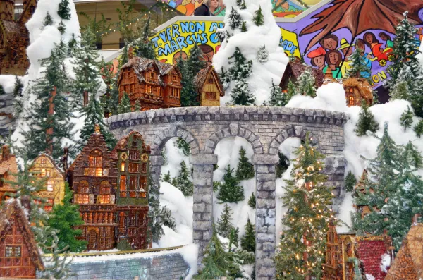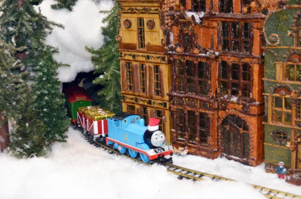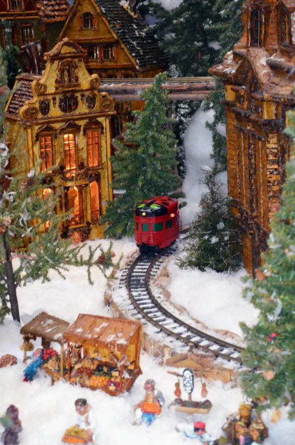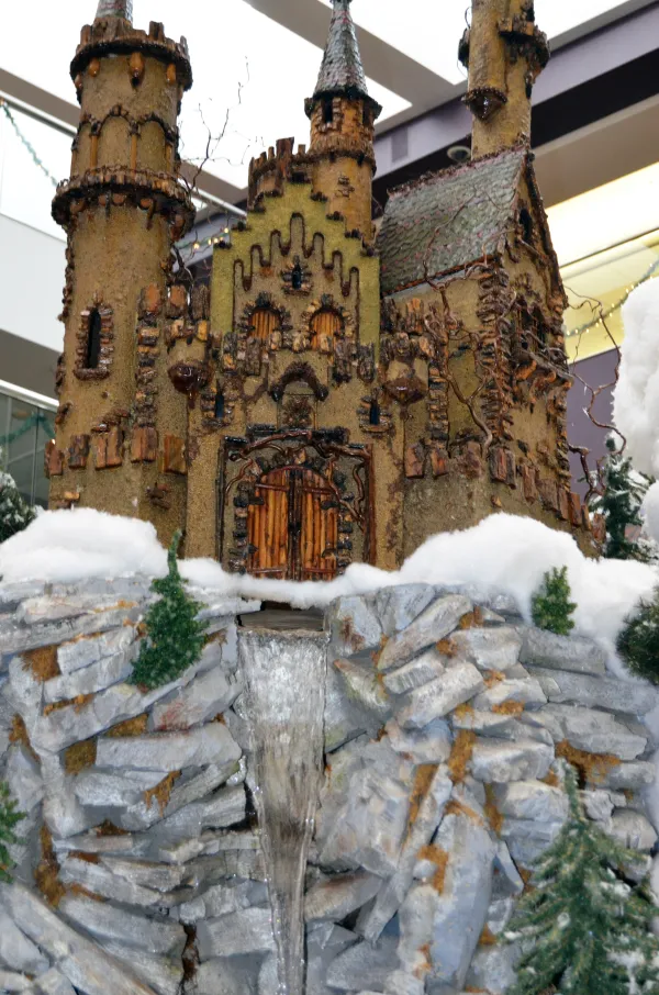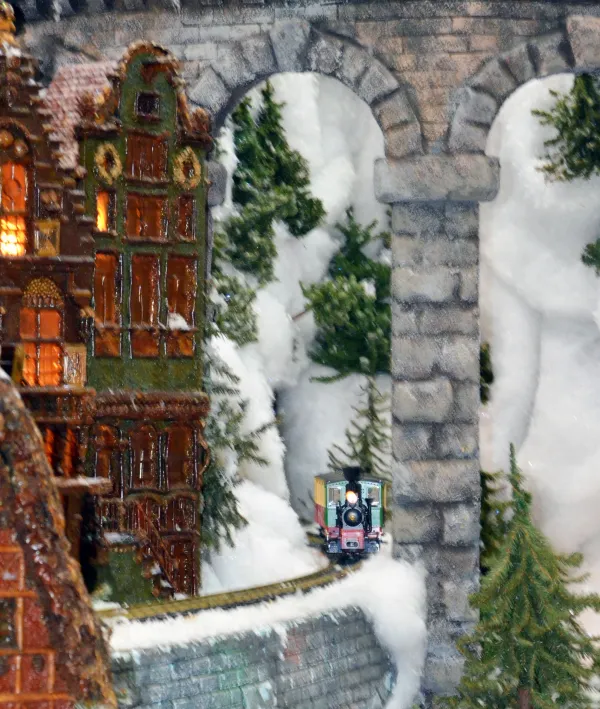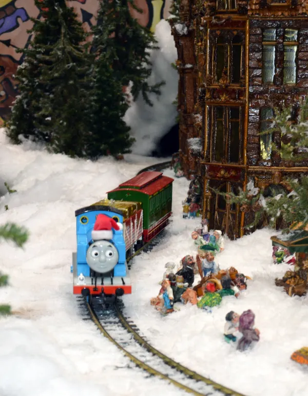 Highlights of the train display include a 6-foot tall cathedral, an 8-foot tall castle and a waterfall that pumps 600 gallons an hour. Each building in the display took between one and three weeks to create. The castle and waterfall took more than three months to complete; it took more than 10 months to build the cathedral.