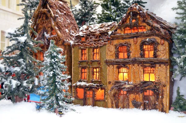 The impressive display spans 600 square feet and includes four trains running on more than 280 feet of track surrounded by more than 50 pounds of snowflakes. The miniature buildings – which are all made from leaves, bark, seeds, pine cones, fungus and moss – are modeled off of actual structures in Germany.