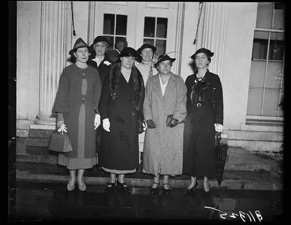 Peace issues discussed with president, Washington, D.C. Sept. 30. Delegation from the Women's International League for Peace and Freedom leaving the White House today after discussing peace issues with President Roosevelt. The women plan to campaign during the month of October. In the group, left to right: (front) Miss Dorothy Detzer, recently returned from the world Peace Congress in Brussels; Mrs. Hannah Clothier Hull, President of the League; Dr. Gertrude C. Bussey, of Goucher College; Mrs. Ernest Gruening. Back row, left to right: Mrs. Frank Aydelotte, of Swarthmore, Pa., and Mrs. Mildred S. Olmstead, who just made an expensive trip through the West and Middle West speaking on the need for peace