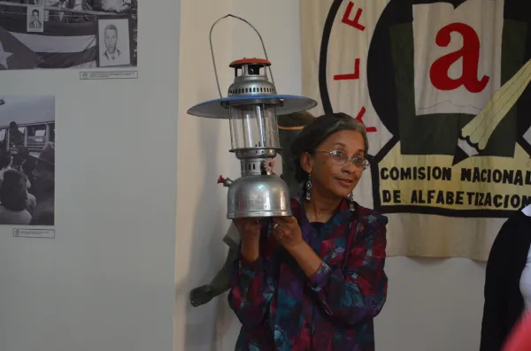 Literacy Museum Director Luisa Yara Campos shows us one of the oil lamps that lit the tutoring session by the Cuban literacy volunteers in the countryside.