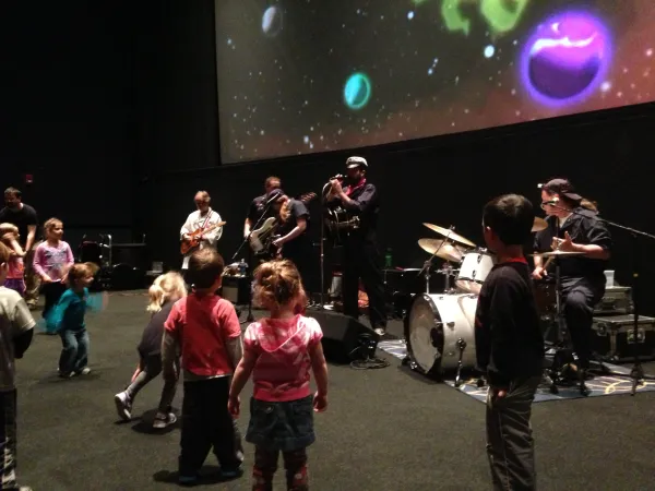 In between sets, the theatre showed short children’s films. The movies were cool, but what the kids really wanted to do was dance. Every time the band started up, they came flying out of their seats as though attracted by a magnet. Some songs are plainly favorites – “Milkshake” from “Blast Off” went over huge – but the kids kept moving throughout. I came home with a tired and happy child.