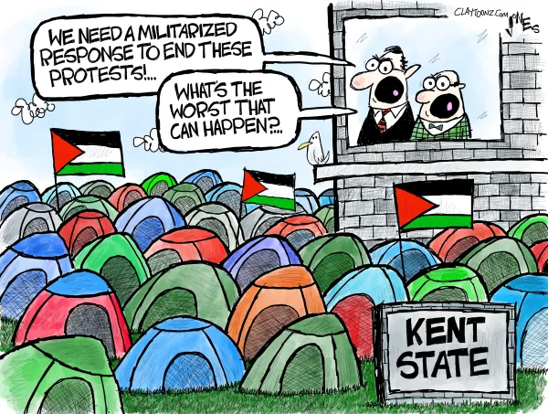 Human politics – from global to local – remain mixed with hatred, dominance and . . . well, dehumanization. We’ve organized ourselves across the planet around one primary principle: the existence of an enemy. The division between “us” and “them” can be based on anything: a difference in race, language, culture – or simply a difference of opinion, which is beginning to happen on campuses across the country, as peaceful, intensely determined protesters, demanding their institutions divest from the Israeli war machine, face violent resistance from police and/or counter-protesters.